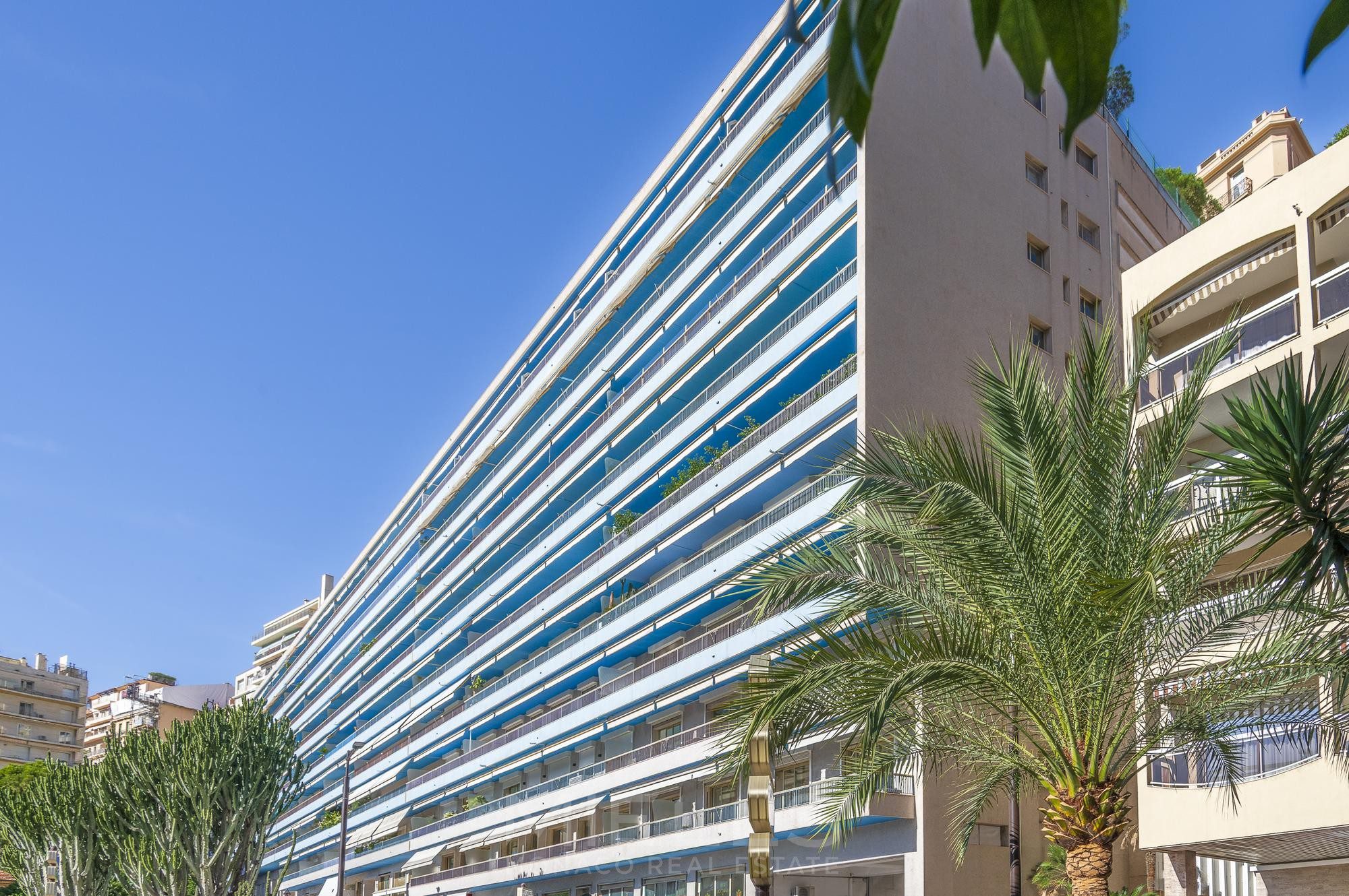 Rising to approximately 32 metres across ten floors, Le Trocadéro features contemporary architecture with clean lines, characterised by a blue-toned façade and continuous balconies. The apartments available for sale cover a wide range of configurations, from studios to four-room units, with floor areas ranging from around fifty square metres to over 200 sqm for the most generous properties. Residents on the middle floors enjoy picturesque views over the Mediterranean, while those on the upper levels take in a breathtaking panorama of the entire Monaco coastline. The interiors, regularly renovated, combine high-end finishes, large bay windows that maximise natural light and terraces that allow residents to fully enjoy the outdoors facing the sea. The building is equipped with a concierge service, modern lifts and a secured underground car park.