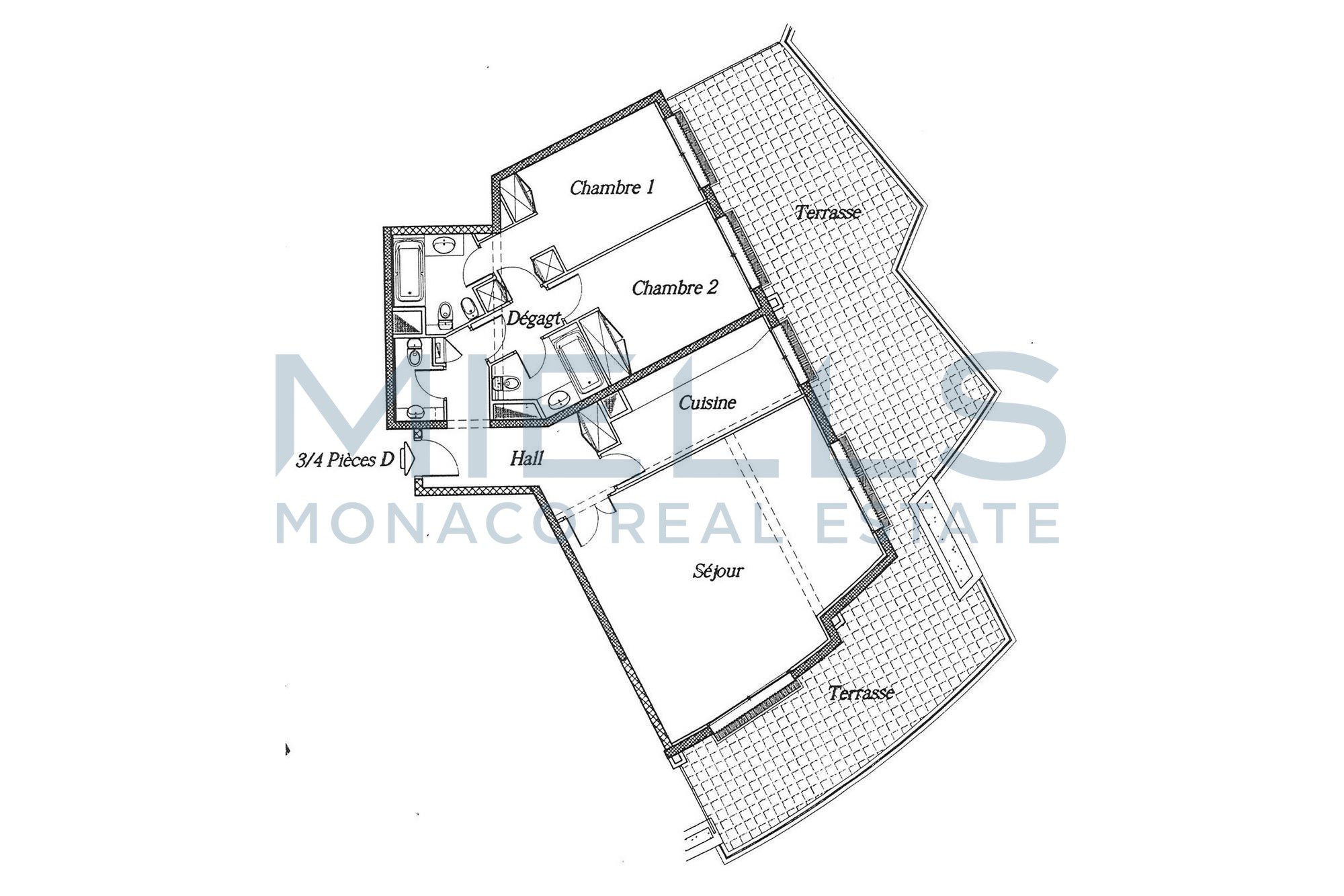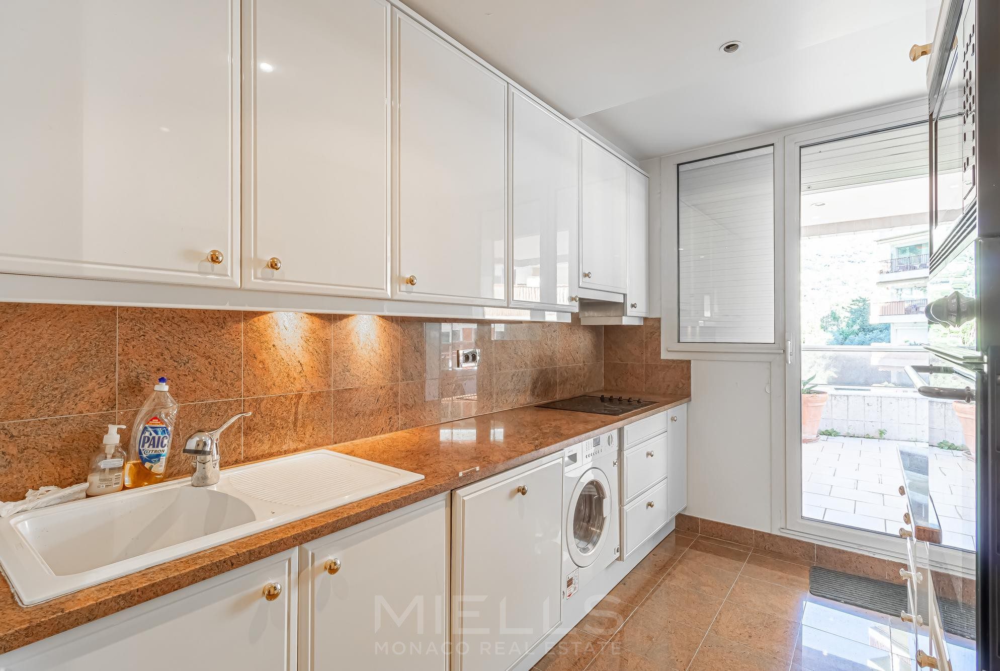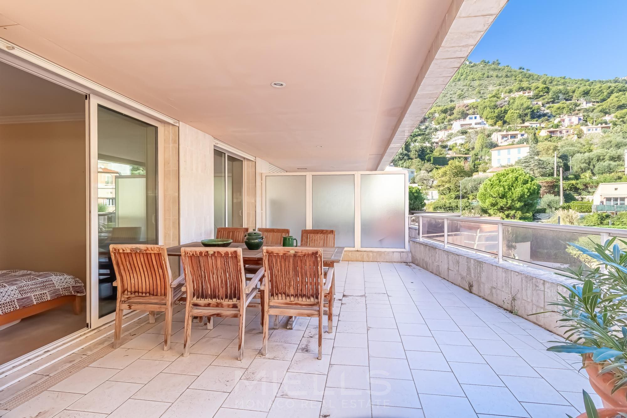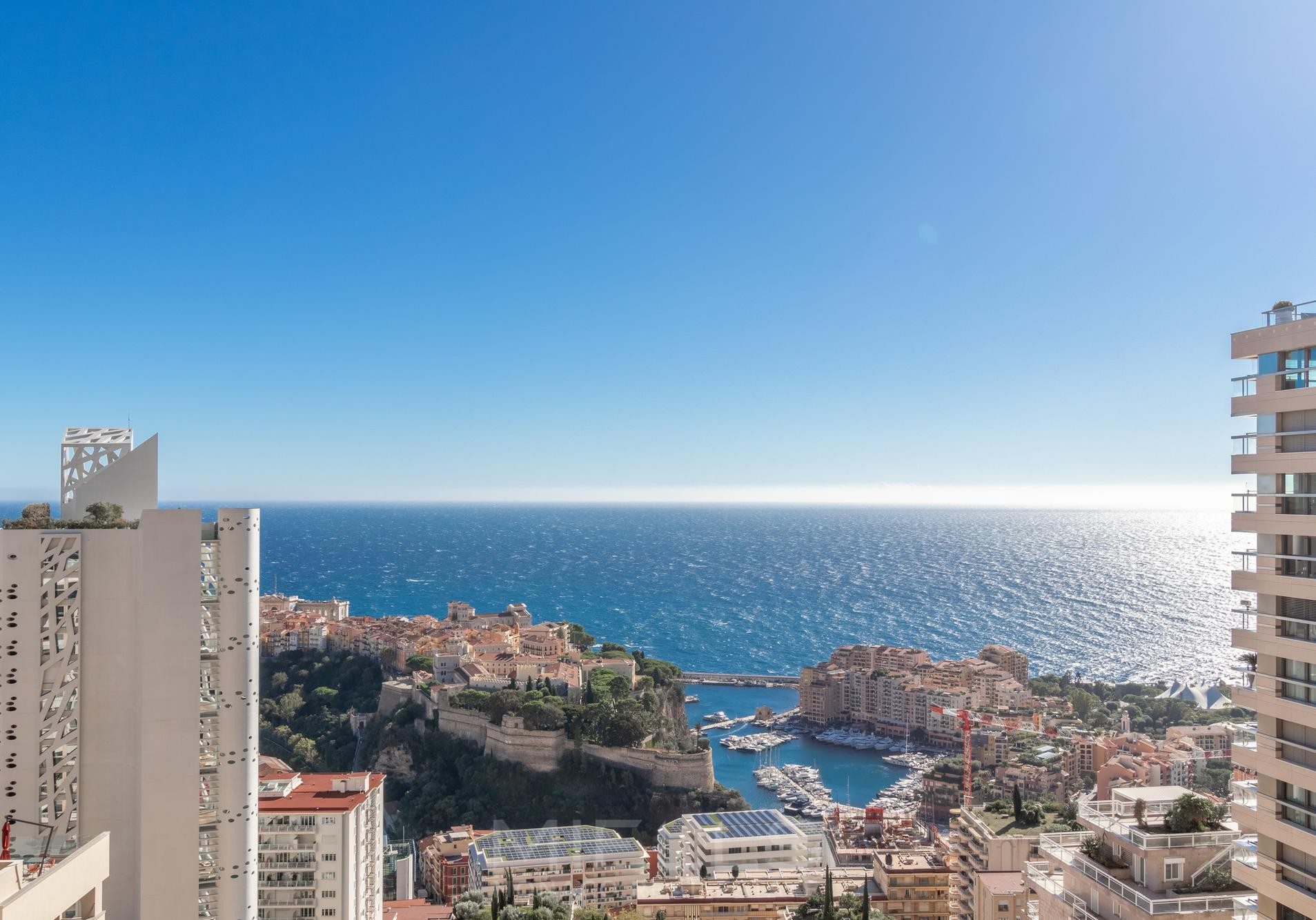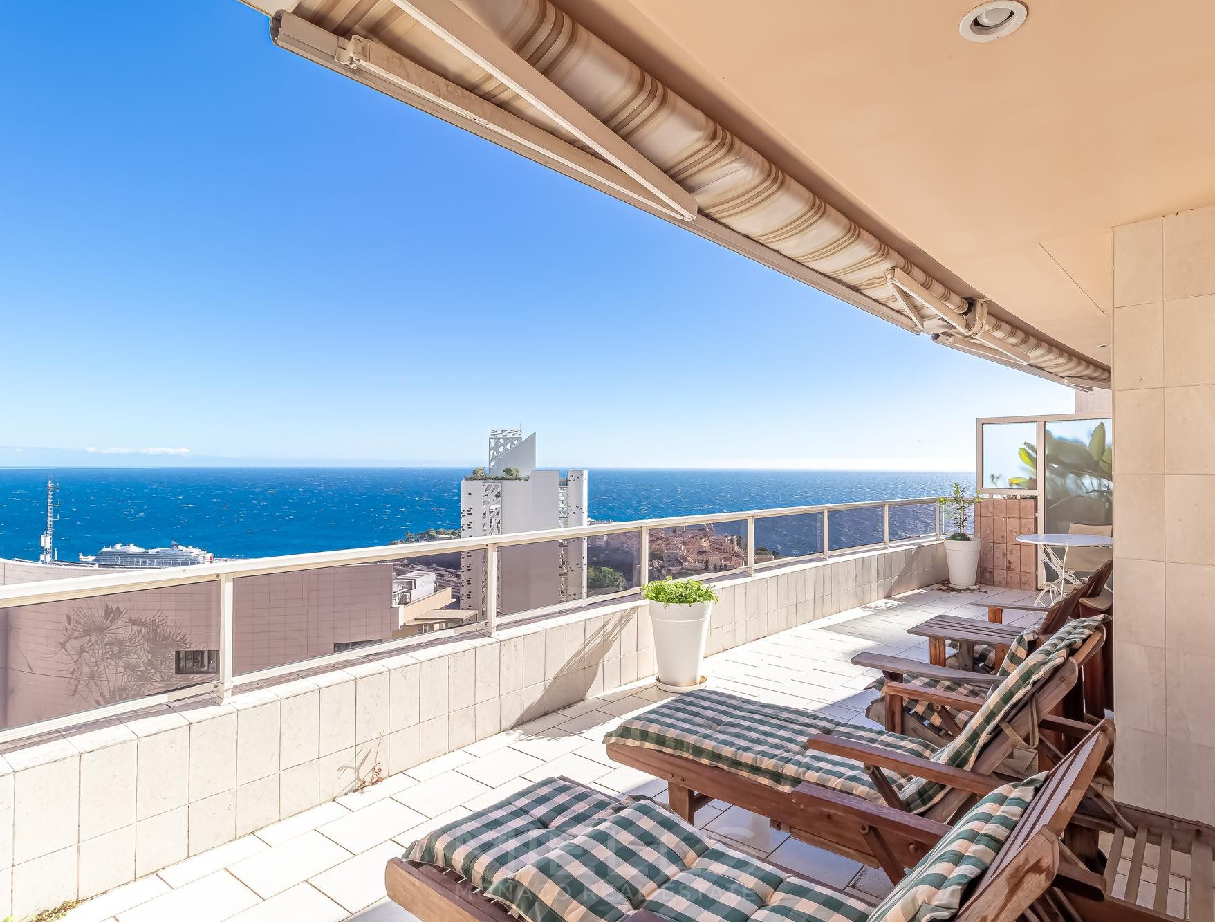 Dans le quartier du Jardin Exotique, lumineux 3 pièces d'une surface de 119 m2 avec une grande terrasse de 79 m2 offrant une jolie vue sur la mer et le Rocher.