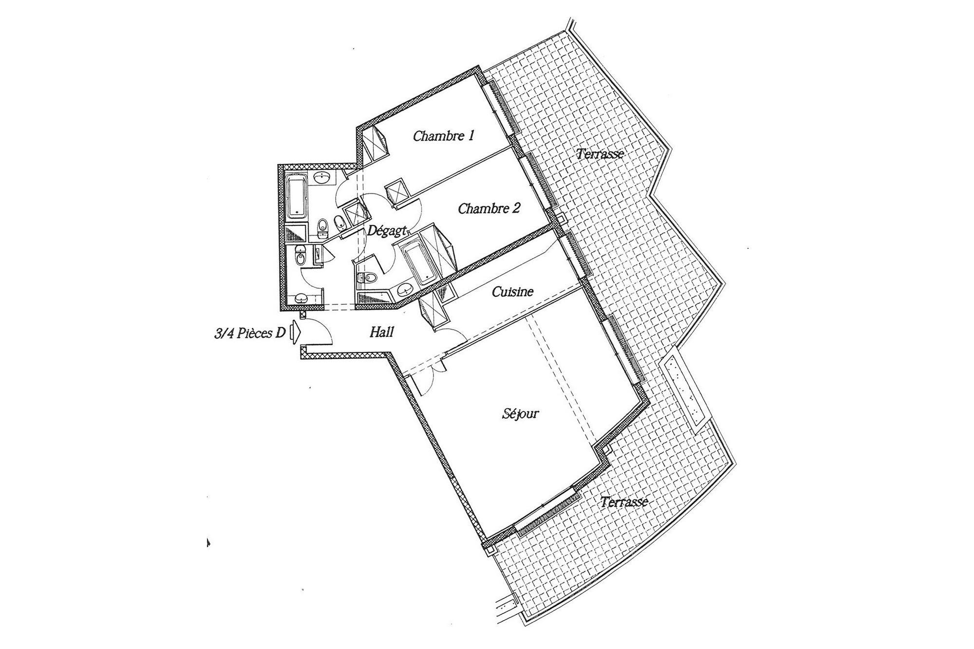 Il se compose d'une entrée, d'un double séjour, une cuisine indépendante équipée, un toilettes invités, 2 chambres avec chacune leur salle de bains, une grande terrasse circulaire ouvre sur chaque pièce.