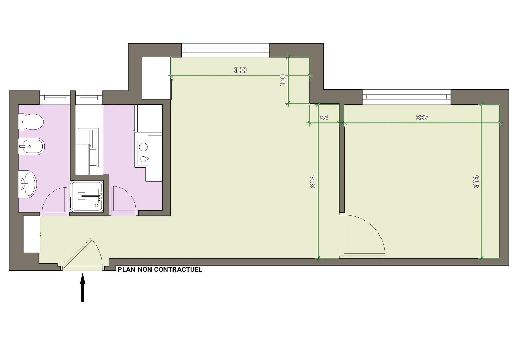 Il se compose d'une entrée avec placard, une petite cuisine équipée, un séjour, une chambre, et une salle de douche. Un parking public se trouve à proximité.