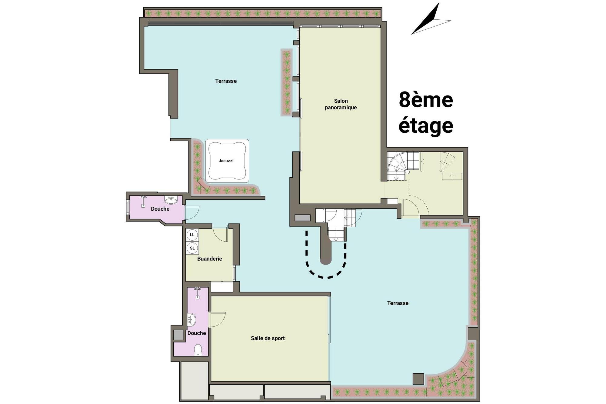 Au 8ème étage, le salon panoramique est un espace de détente idéal, baigné de lumière. Vous y trouverez également une buanderie pratique et une salle de douche avec toilette. Une pièce annexe polyvalente avec salle de douche et toilettes pouvant servir de bureau, de salle de sport ou de chambre supplémentaire. La grande terrasse, dotée d’un jacuzzi, est parfaite pour se relaxer en plein air. De plus, un escalier vous conduit au solarium, un espace privilégié pour profiter du soleil.