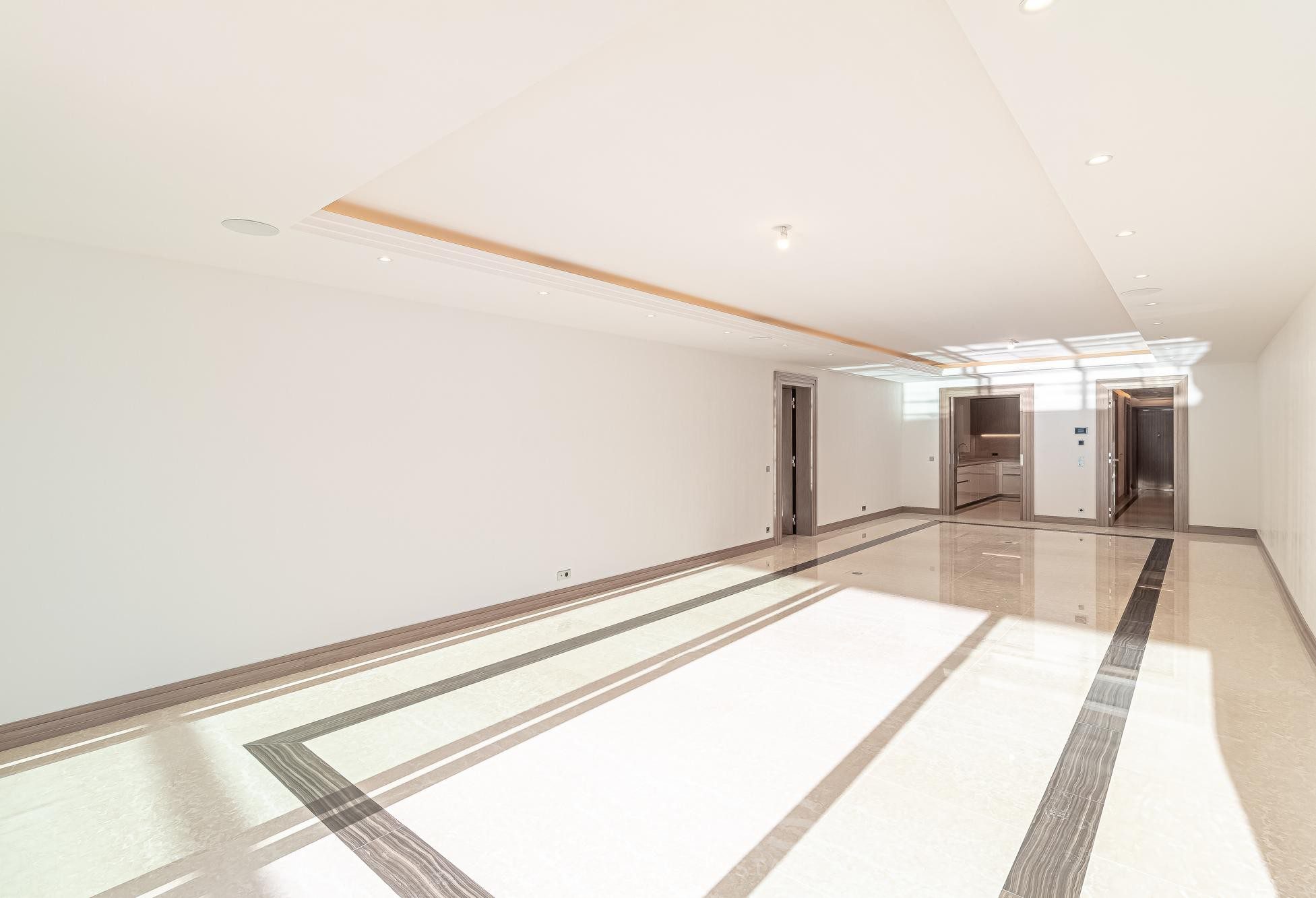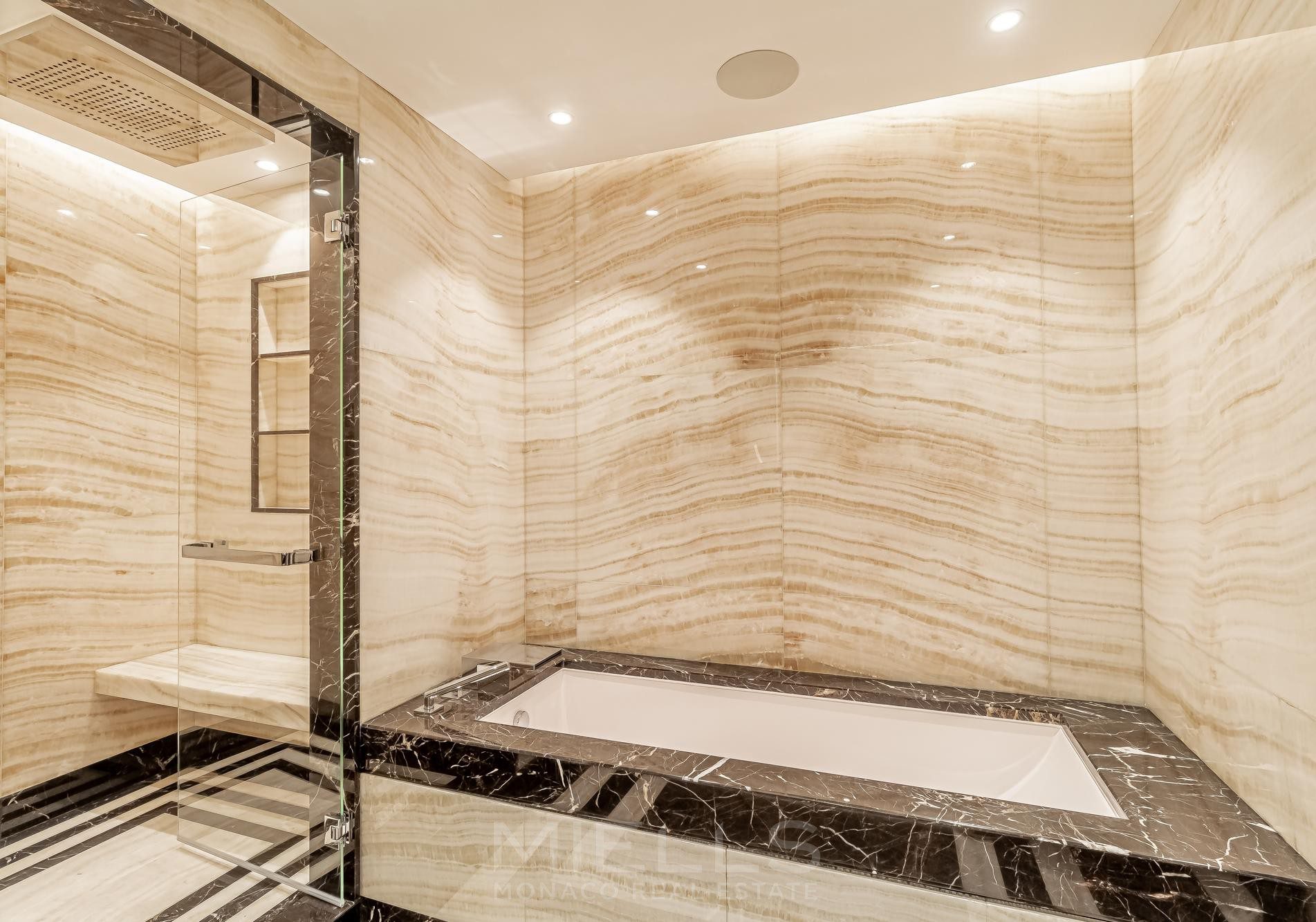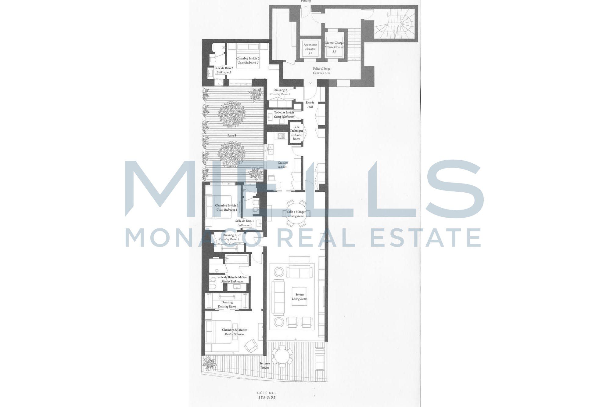 Questo sontuoso appartamento con vista mare si apre su un ampio ingresso rivestito in elegante marmo lavorato con precisione, con cornici delle porte in rovere e tiglio; il doppio soggiorno con zona pranzo è dotato di finestre a tutta altezza con porte scorrevoli che si aprono sulla terrazza, permettendo una luminosità ottimale ed una splendida vista sul Mediterraneo. La cucina indipendente, completamente attrezzata con elettrodomestici di ultima generazione. La camera padronale, ornata di lussuosi rivestimenti murali, è dotata di cabina armadio e di un bagno dal design lineare. Due ulteriori camere da letto, ciascuna con bagno privato, si affacciano su un patio. Una cantina e un posto auto completano questa eccezionale proprietà.