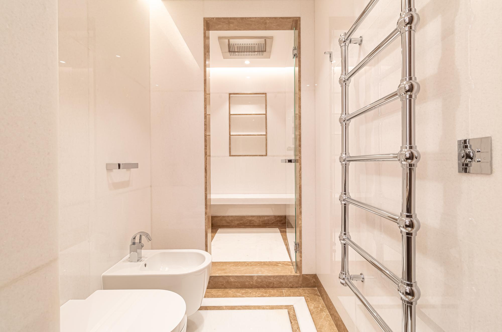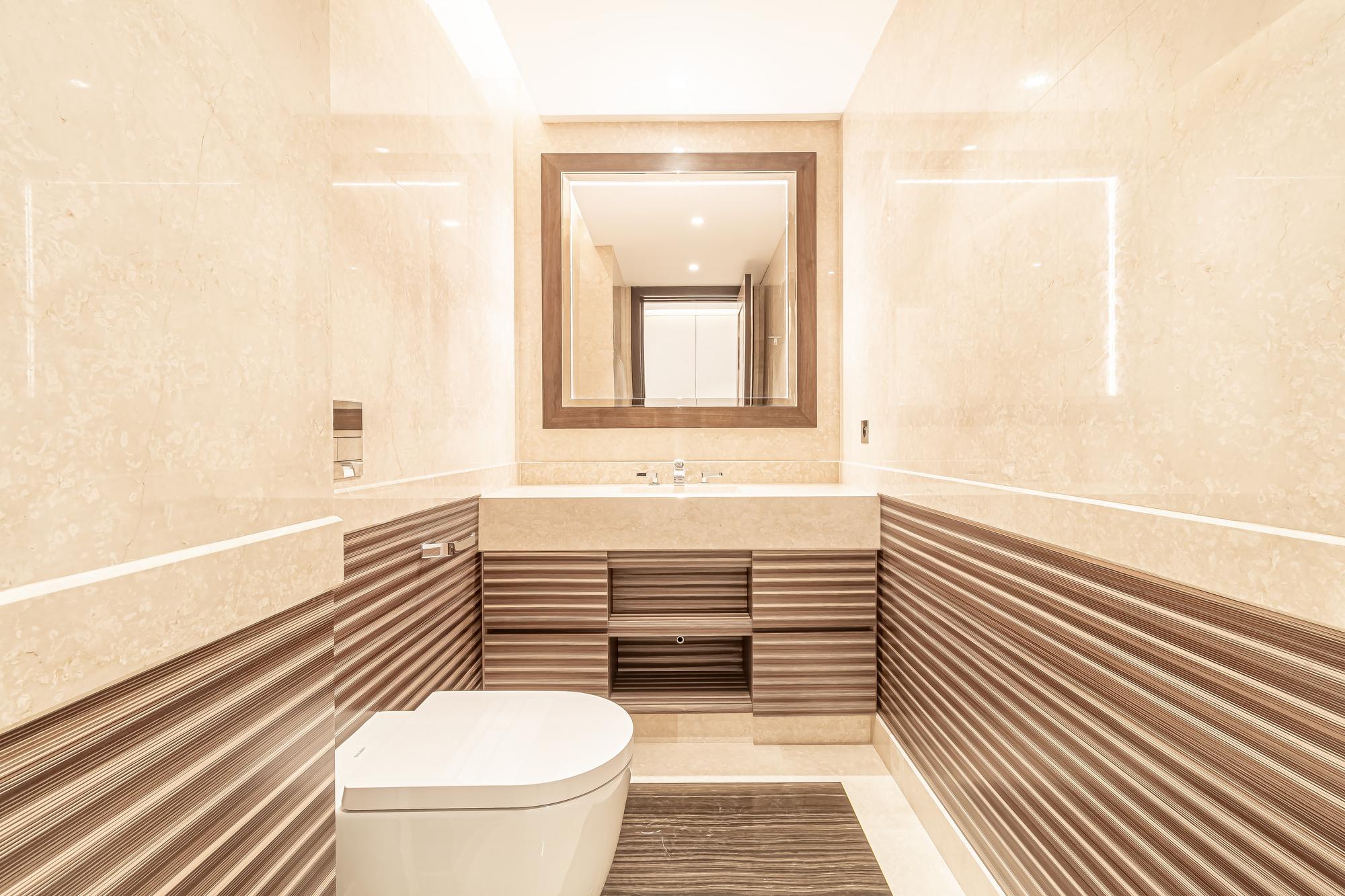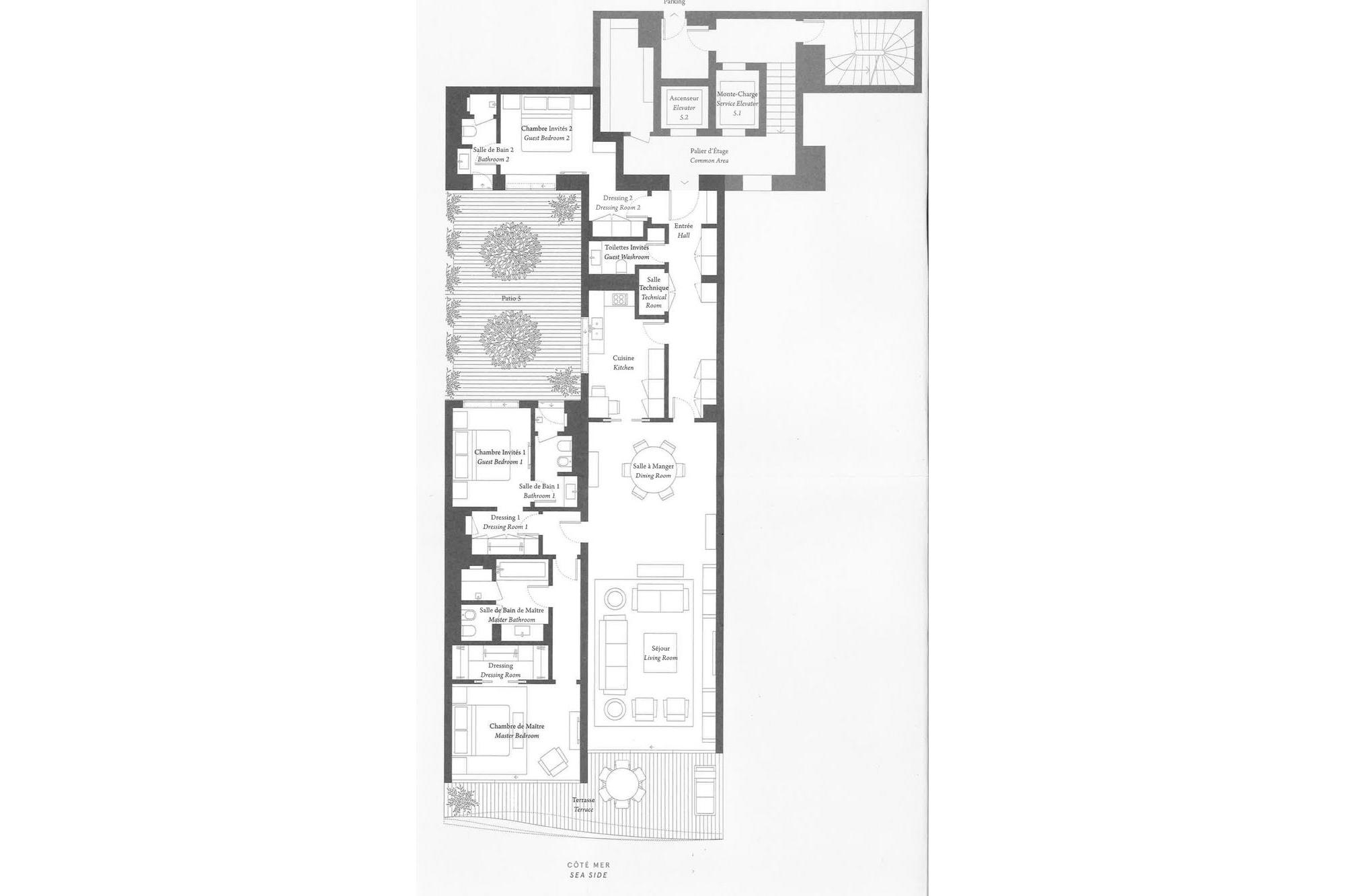 Questo sontuoso appartamento con vista mare si apre su un ampio ingresso rivestito in elegante marmo lavorato con precisione, con cornici delle porte in rovere e tiglio; il doppio soggiorno con zona pranzo è dotato di finestre a tutta altezza con porte scorrevoli che si aprono sulla terrazza, permettendo una luminosità ottimale ed una splendida vista sul Mediterraneo. La cucina indipendente, completamente attrezzata con elettrodomestici di ultima generazione. La camera padronale, ornata di lussuosi rivestimenti murali, è dotata di cabina armadio e di un bagno dal design lineare. Due ulteriori camere da letto, ciascuna con bagno privato, si affacciano su un patio. Una cantina e un posto auto completano questa eccezionale proprietà.