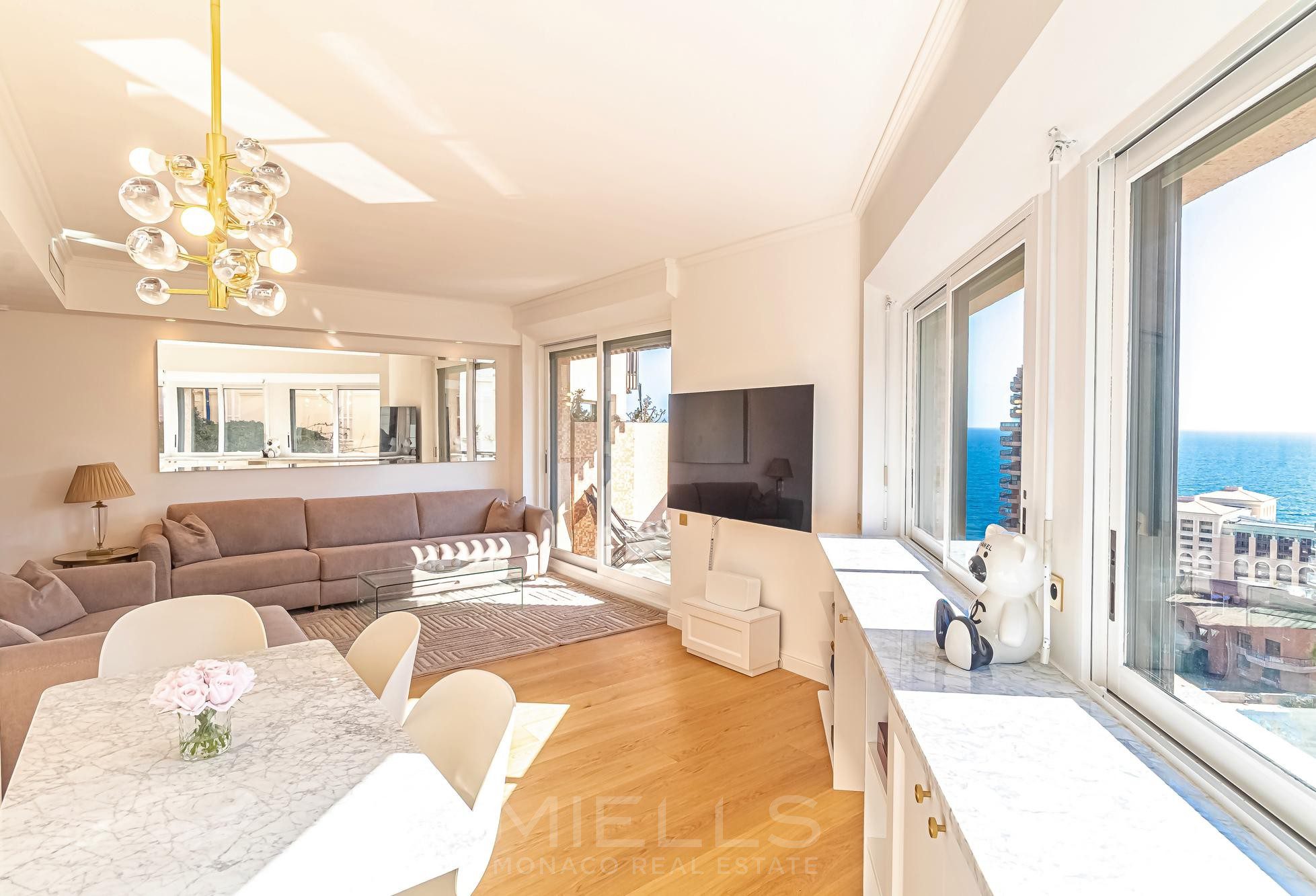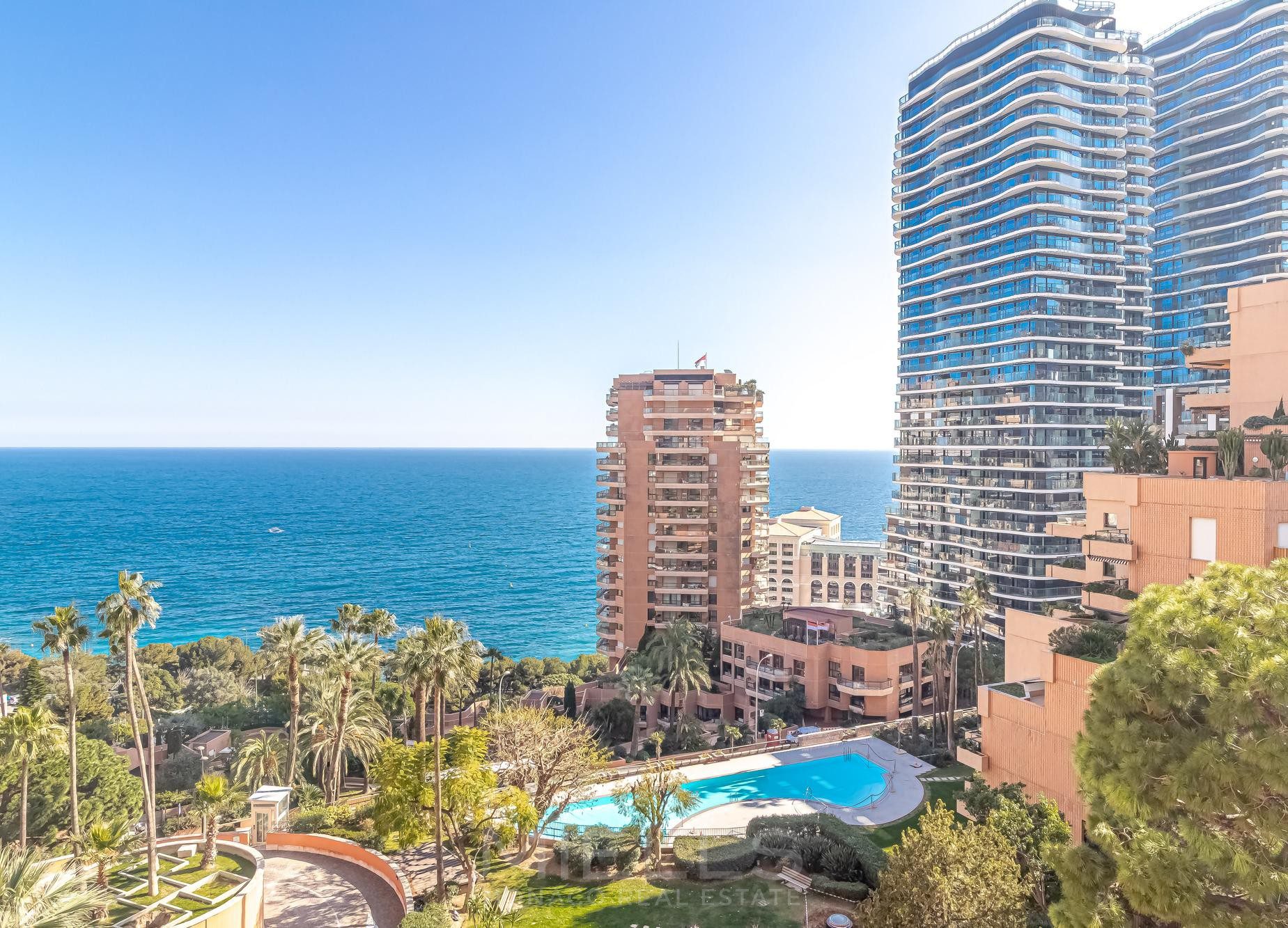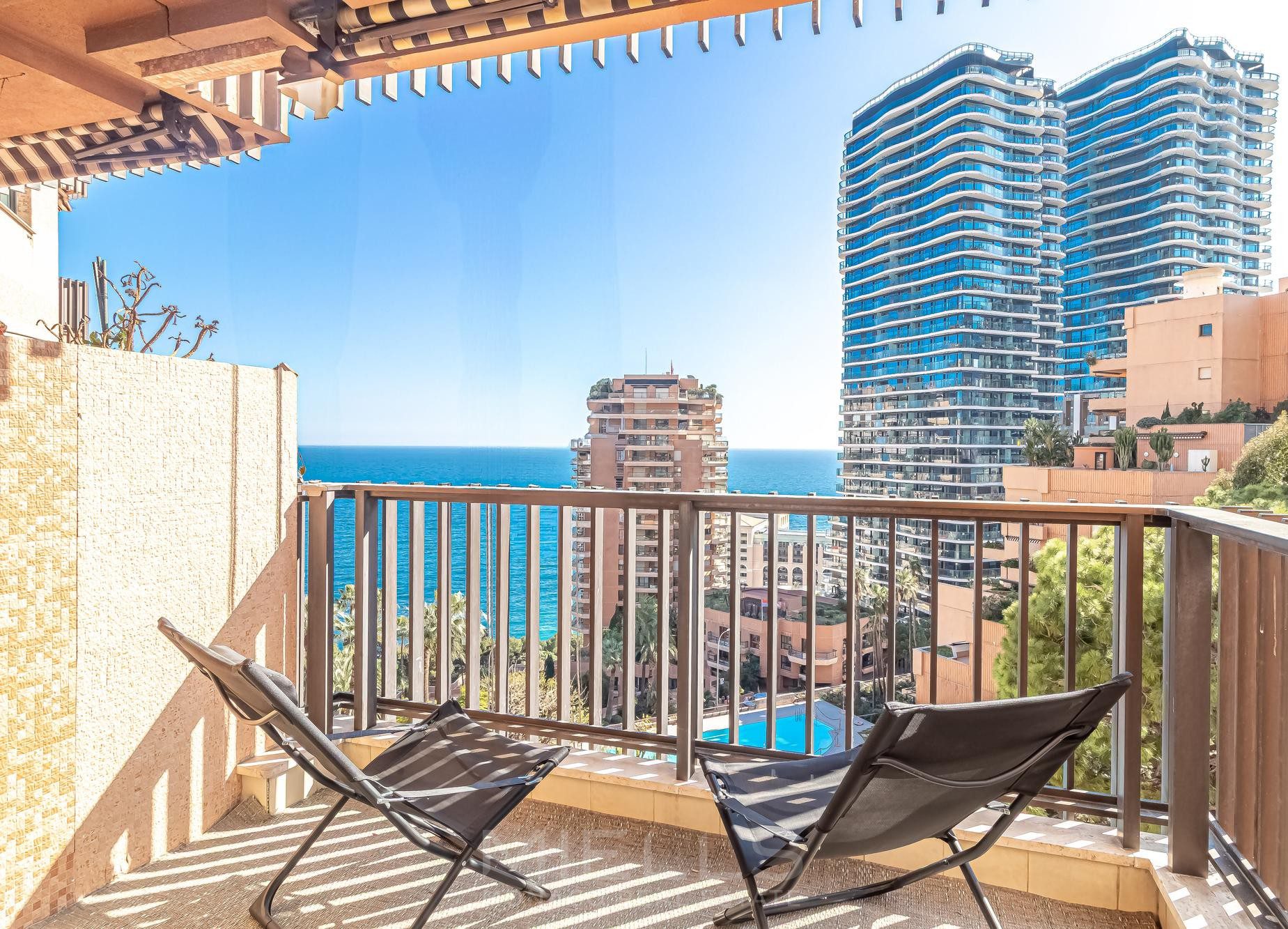 Nel quartiere di Saint Roman, vicino alla prestigiosa spiaggia del Monte-Carlo Beach e ai campi del Country Club, ampio bilocale ristrutturato e arredato con terrazze, che offre una bellissima vista mare in una splendida residenza con piscina