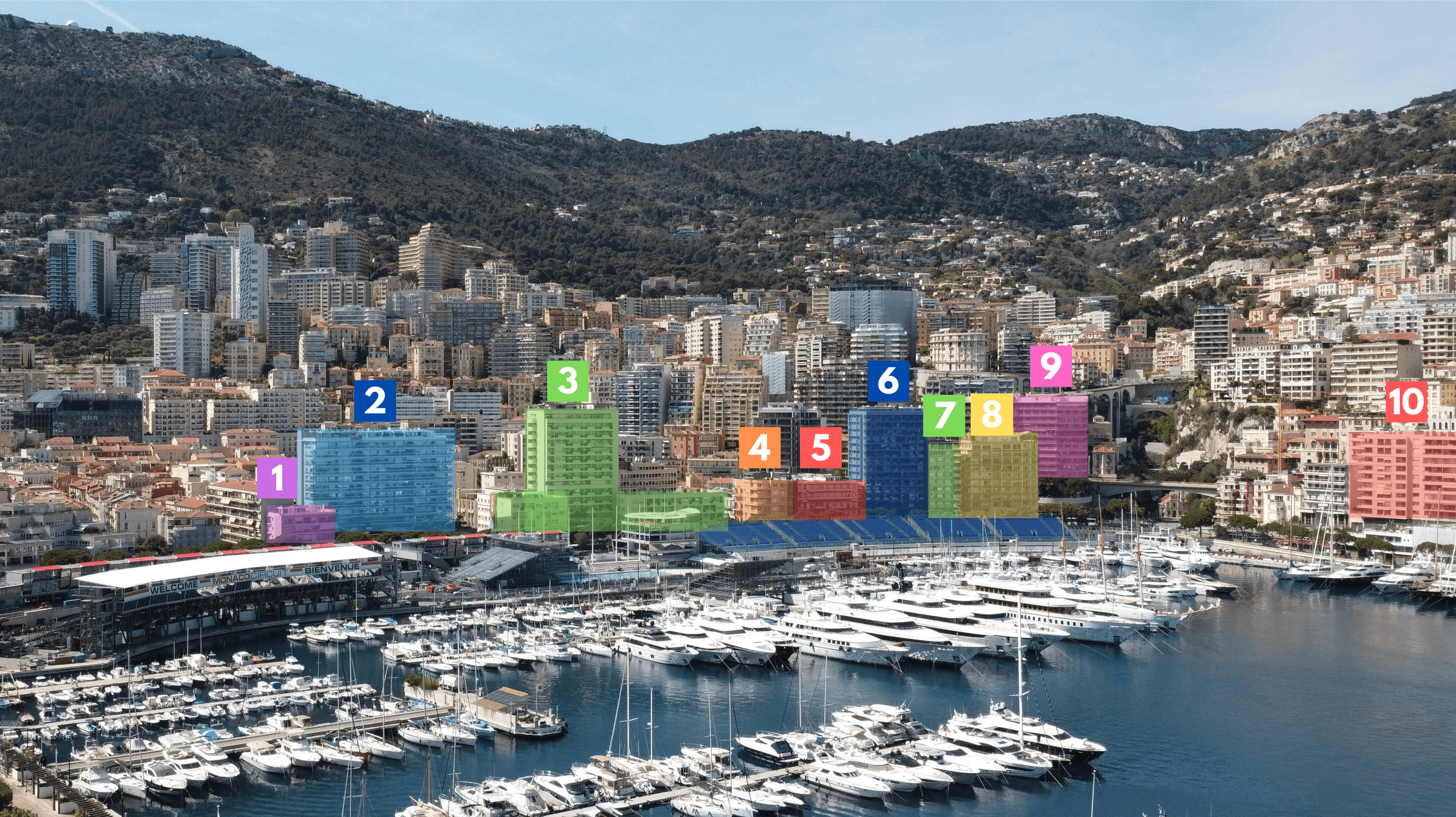 Una decina di residenze monegasche offrono una vista diretta sul circuito del Gran Premio, consentendo di assistere alla gara dal comfort di un appartamento o di una terrazza di prestigio: L’Albatros (1), Le Shangri-la (2), Le Palais Héraclès (3), Les Hirondelles (4), Le Palais Majestic (5), Les Caravelles (6), Le Bristol (7), L’Ermanno Palace (8), Le Panorama (9), Le Beau Rivage (10)