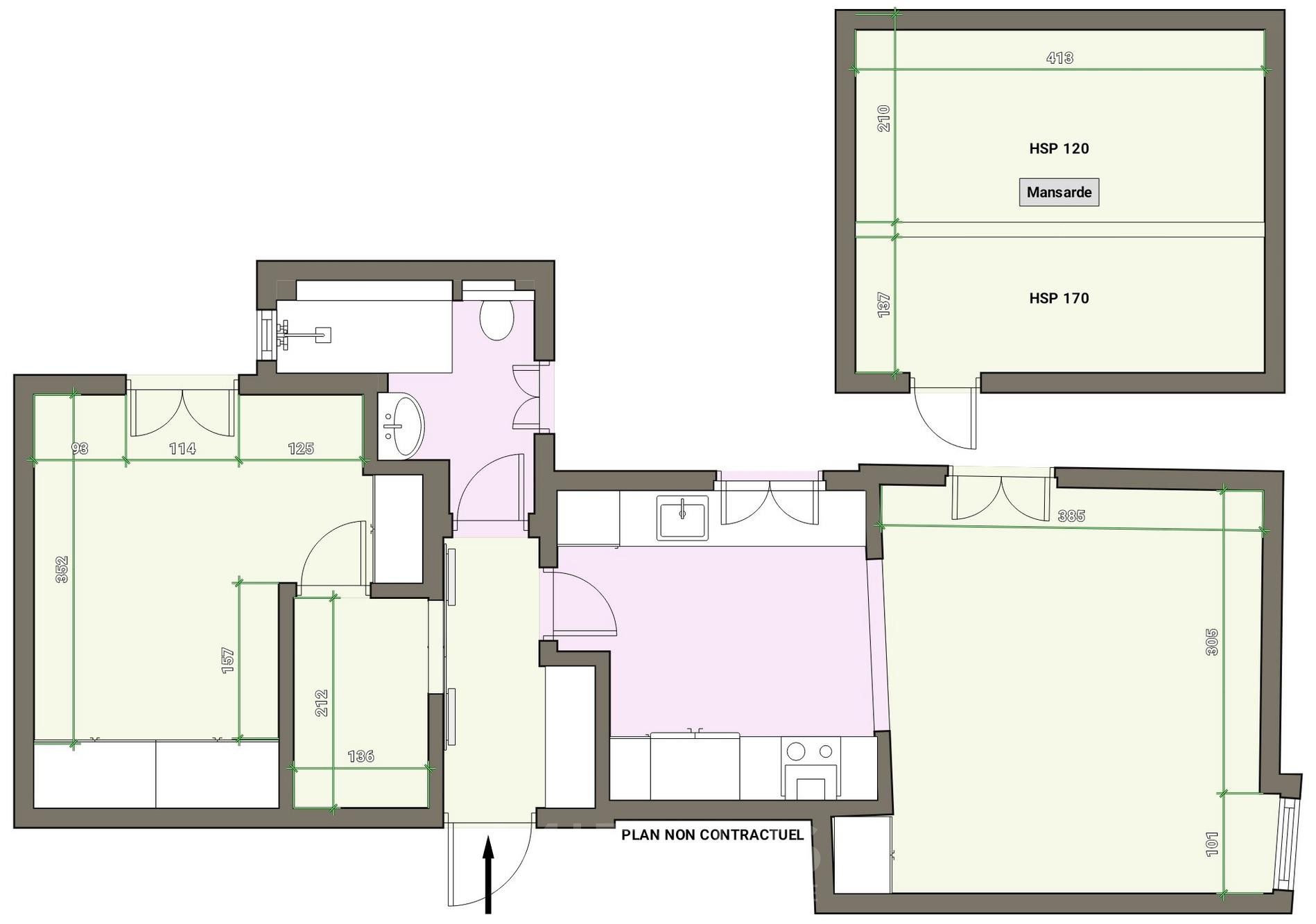 Composed by : entrance hall, open plan kitchen on the living room, bathroom, separated space of 3 sqm, 2 dressings, bedroom, 14 sqm of garret on the top with velux system.