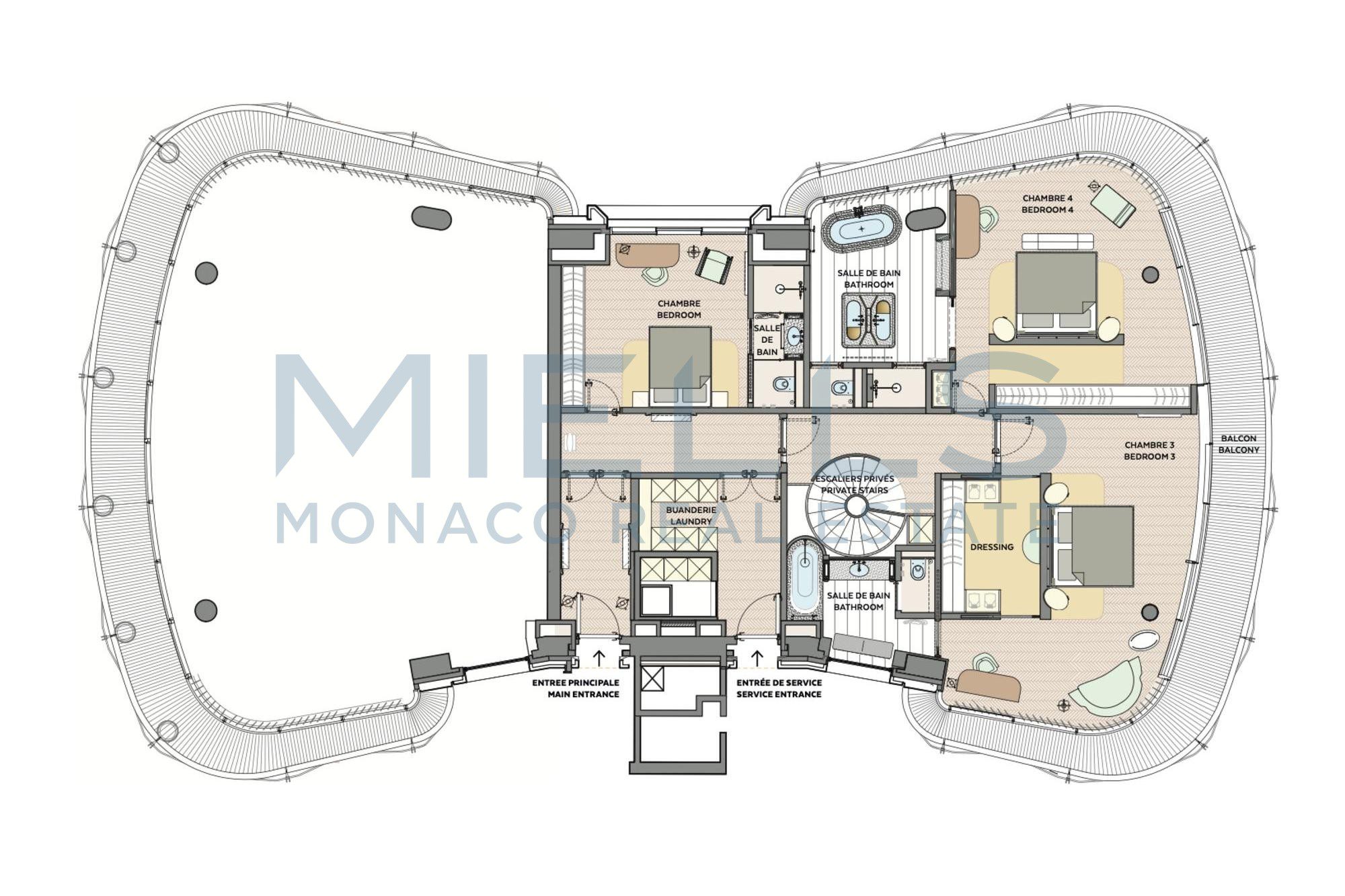 With 480 sqm of living space, this exceptional duplex property enjoys a very pleasant view over the Casino gardens. It features 5 bedrooms, including a Master suite, each with its own en-suite full bathroom.