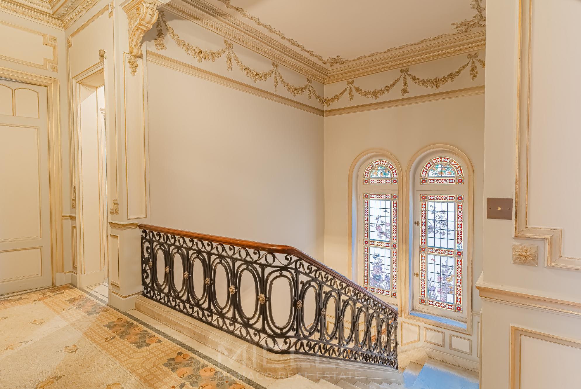 A second staircase - both grand and elegant, adorned with stained glass and a wrought-iron banister, leads to the sleeping quarters. This floor hosts a stunning master suite with 3 sets of windows, a bedroom with a marble fireplace, another double bedroom with a shower. An additional room with a mosaic, indoor basin pool completes this level.