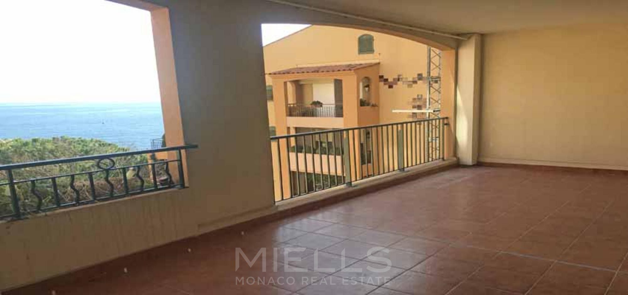 Pleasant and very well laid out, the apartment consists of an entrance hall, a living room with a fully equipped open kitchen, a bedroom with its en-suite full bathroom and numerous closets. The living room and the bedroom open onto a large terrace enjoying a beautiful view of the sea and the residence’s pool.