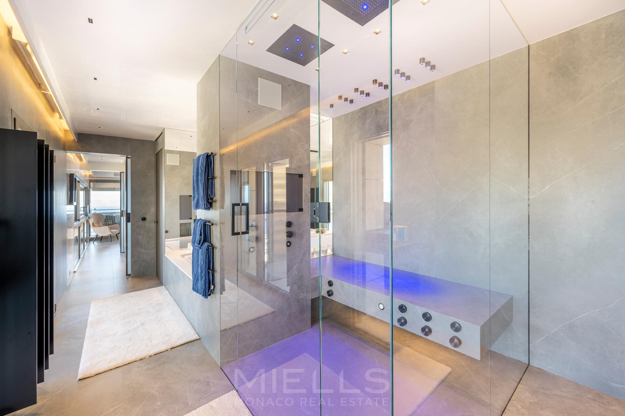 Квартира состоит из 5 спален, каждая с собственной ванной комнатой. Главная спальня выходит на большую террасу и располагает домашним кинотеатром, двумя гардеробными, а также оздоровительной зоной с джакузи. В жилой зоне находится просторная гостиная, столовая и просторная функциональная кухня.