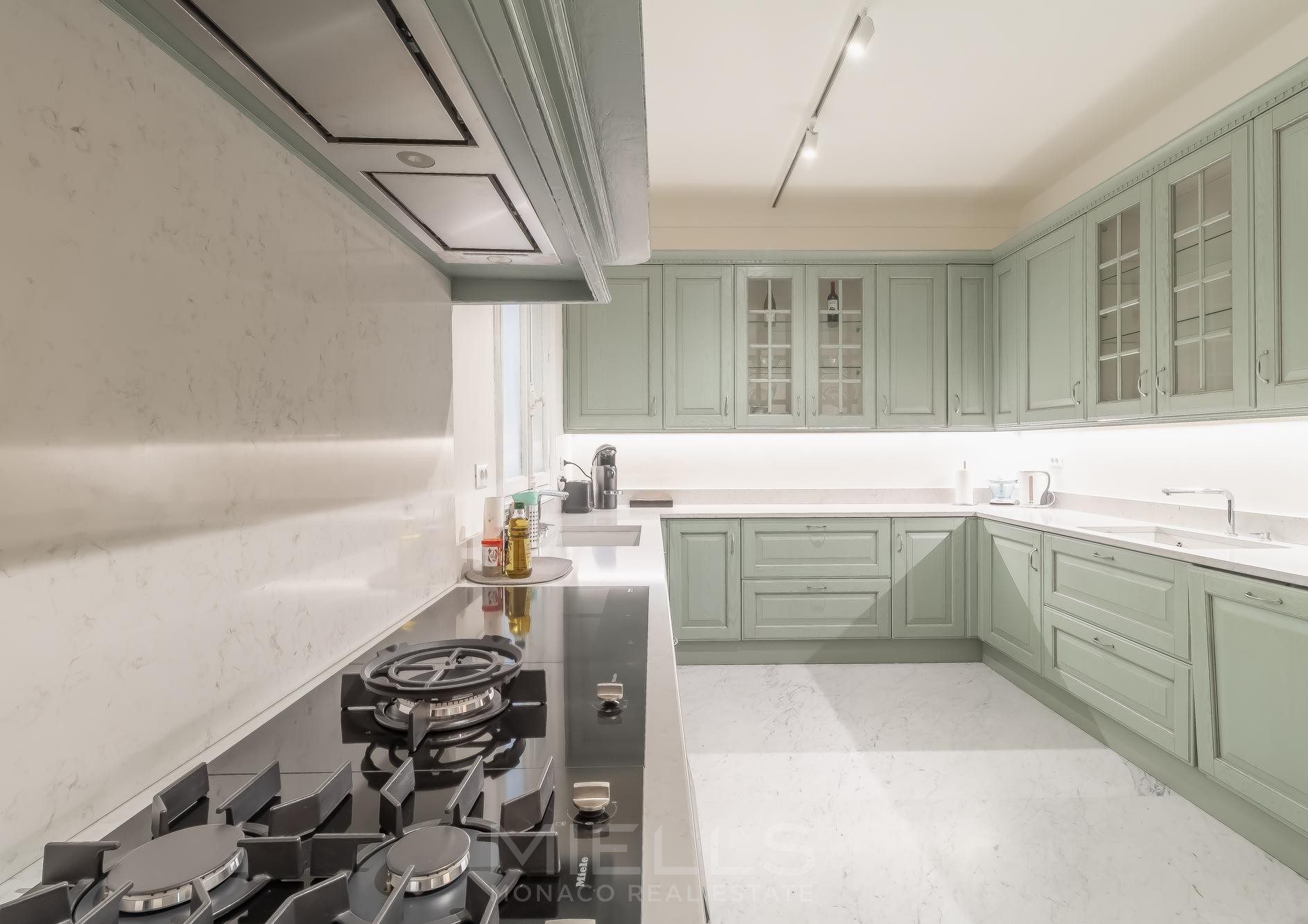 На первом этаже роскошный вестибюль ведет в просторную двойную гостиную, украшенную ионическими колоннами из белого мрамора и элегантным мраморным камином. Туалет для гостей дополняет этот уровень. Кабинет с камином также обогащает это пространство.