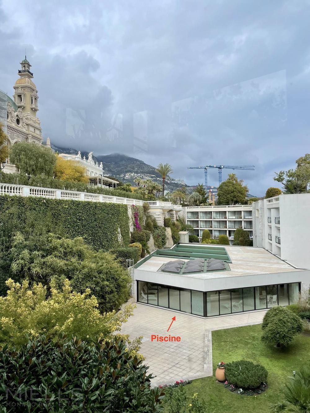 Высотное здание между террасами Казино и морем, около яхт- клуба. Сауна и красивый бассейн с подогревом (летом открытый, зимой крытый), с садом и солярием. Круглосуточный консьерж. Пешеходный проход к террасам Казино.