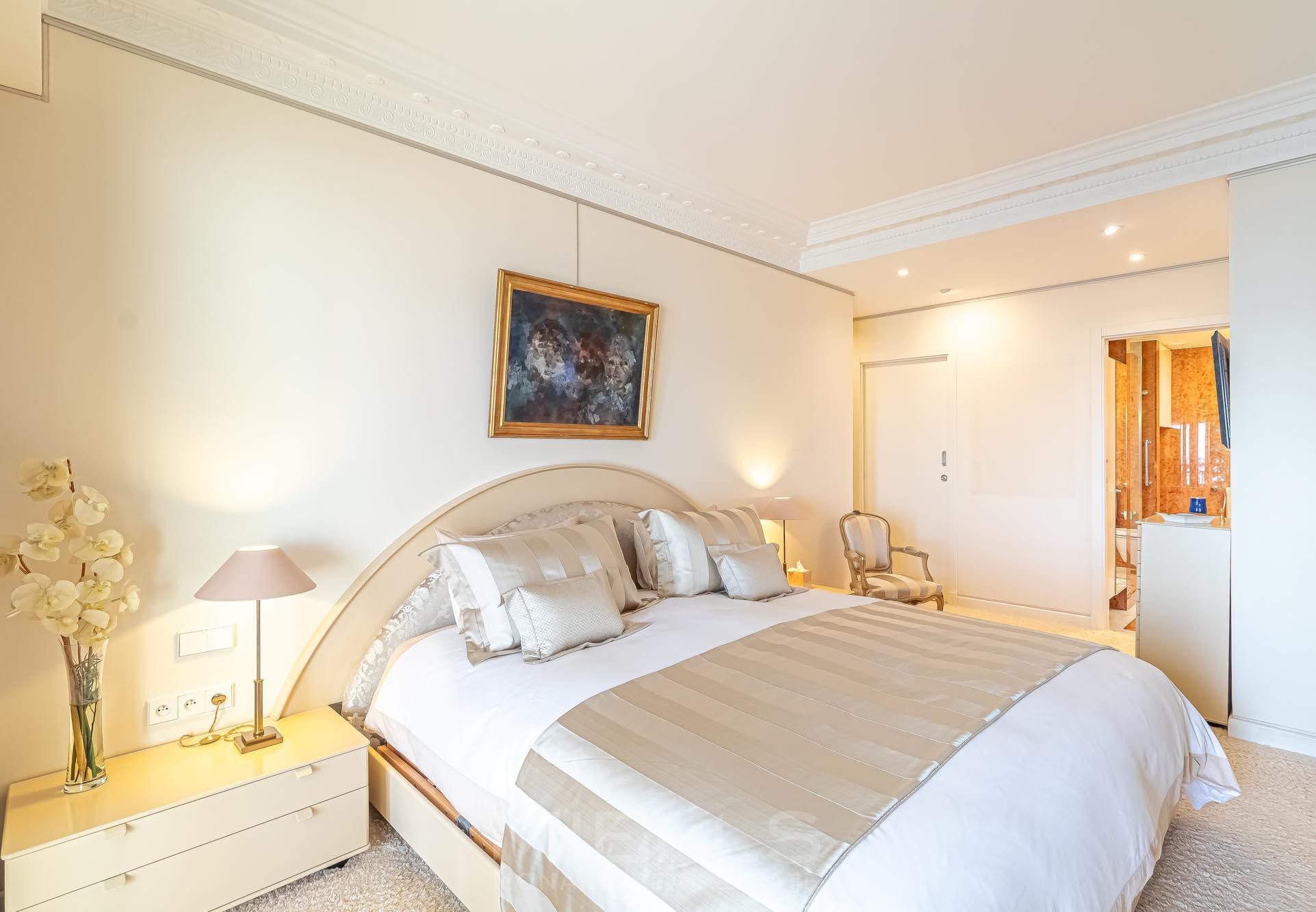В квартире площадью 330 м²: пять спален, четыре ванные комнаты, просторный салон, столовая с открытой кухней выходит на солнечную террасу. К квартире можно подняться на собственном лифте, из окон открывается феерический вид на Средиземное море и порт Кап дАй.